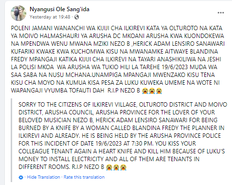 Nezo B, a well-known Bongo Flava singer and songwriter from Tanzania, was reportedly killed in a cold-blooded murder. He was allegedly stabbed by Blandina Fredrick, an Ilkirevi resident who is currently in police custody.