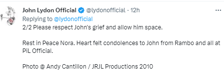 “Please respect John’s grief and allow him space. Rest in Peace Nora. Heart felt condolences to John from Rambo and all at PiL Official.”