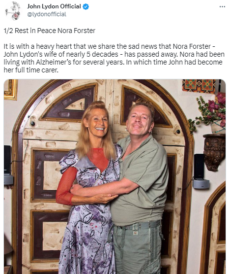 “It is with a heavy heart that we share the sad news that Nora Forster – John Lydon’s wife of nearly 5 decades – has passed away.”