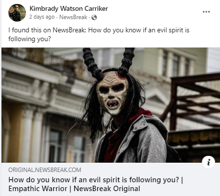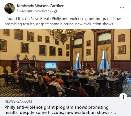 Carriker also shared two articles on Facebook, one headed “Philly anti-violence grant program shows promising results, despite some hiccups,” and the other, “how do you know if an evil spirit is following you.”