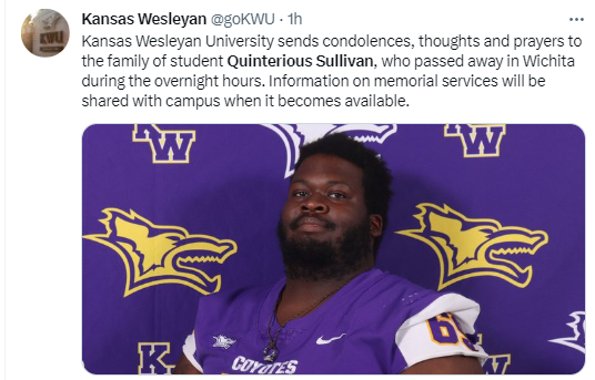 “Kansas Wesleyan University sends condolences, thoughts and prayers to the family of student Quinterious Sullivan, who passed away in Wichita during the overnight hours.”