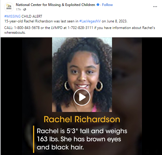 To find the missing 15-year-old Rachel Richardson, the Las Vegas Metropolitan Police Department is seeking the public’s assistance. If you know Rachel’s location, please call 1-800-843-5678 or the LVMPD at 702-828-3111.