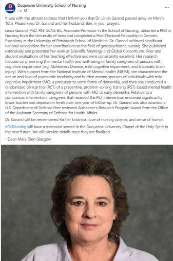 Dr. Garand will be remembered for her kindness, love of nursing science, and sense of humor.#DUNursing will have a memorial service in the Duquesne University Chapel of the Holy Spirit in the near future. We will provide details once they are finalized.”