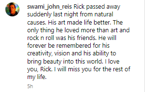 “Rick passed away suddenly last night from natural causes. His art made life better. The only thing he loved more than art and rock n roll was his friends.