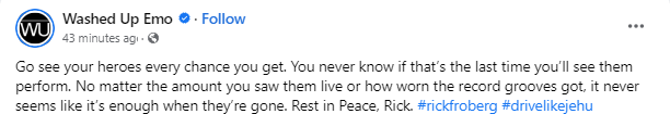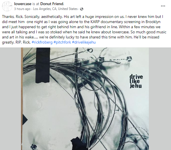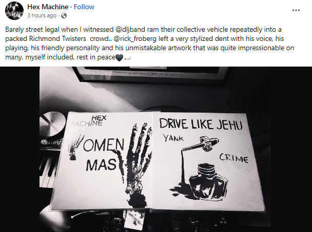 Bullets or Balloons Band wrote: “RIP Rick Froberg. Singer for Pitchfork, Drive Like Jehu, Hot Snakes and Obits. Guitarist for all but the first aforementioned. I can’t convey how important this man was in my life as a musician. RIP and my condolences to his family, friends and band mates, past and present. I’m crushed. – Henry”