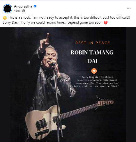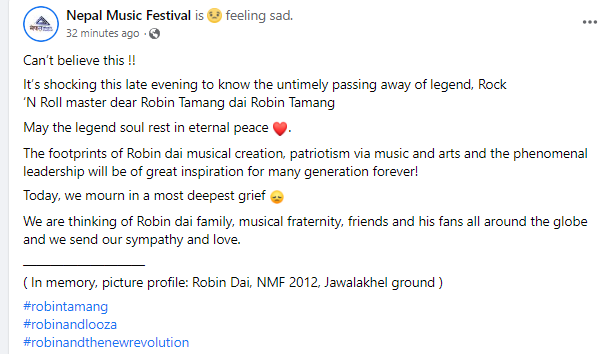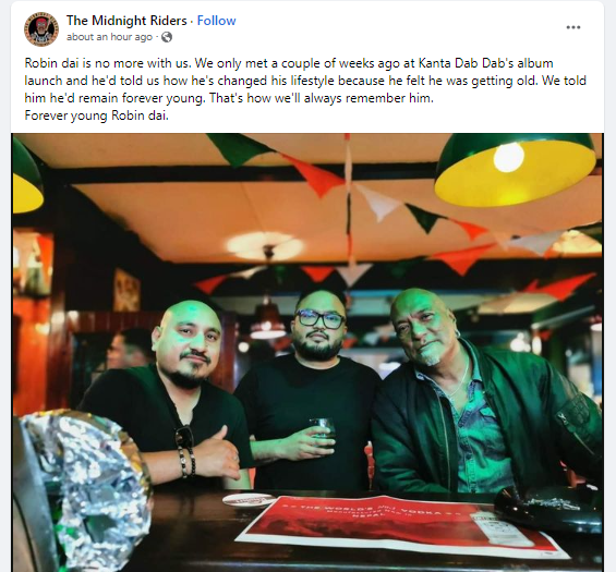 Artist Madan Cobweb wrote: “I just can’t believe.We lost another legend..What the f**k. Robin tamang dai is no more with us so sad to hear..Rest in paradise beautiful soul.. Source Sabin Rai”