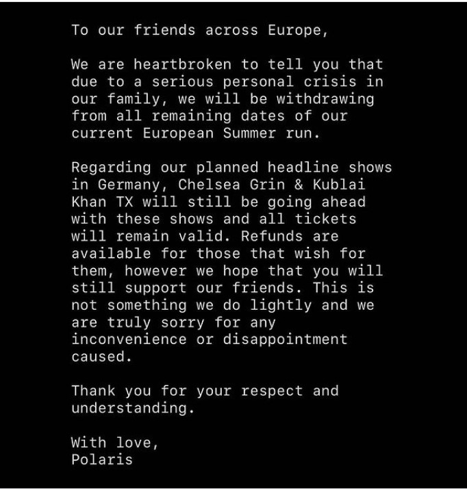 The Sydney guitarist passed away on June 19 in the early hours of the morning, only days before the band had to postpone a handful of their European tour dates. With Siew absent, Polaris last played on June 18 at the Graspop Metal Meeting in Belgium.