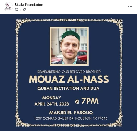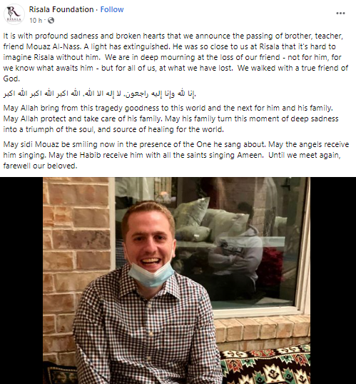 “It is with profound sadness and broken hearts that we announce the passing of brother, teacher, friend Mouaz Al-Nass. A light has extinguished. He was so close to us at Risala that it’s hard to imagine Risala without him. We are in deep mourning at the loss of our friend – not for him, for we know what awaits him – but for all of us, at what we have lost. We walked with a true friend of God.”