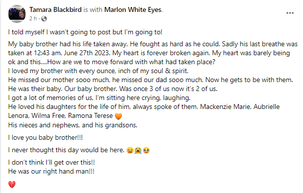 One of his friend Myron Freemont Sr. wrote: “Gmorning everyone! UMONHON relatives walking in tears R.I.P. Brother Marlon White Eyes always had a smile always had good words when we see each other your gonna be missed until we meet again brother can’t believe it.”