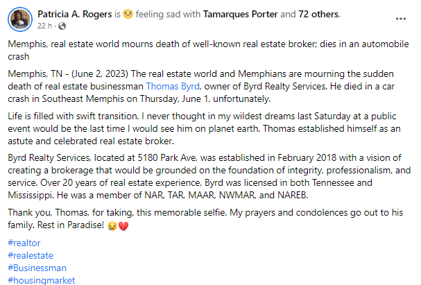 On June 1, 2023, Thomas Byrd, a Memphis, Tennessee-based real estate agent and broker, tragically passed away.