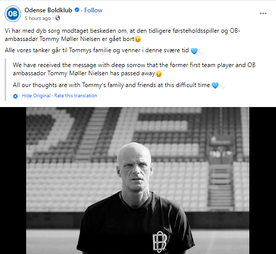 “It is with deep sadness that we have received the message that the former first team player and OB ambassador Tommy Møller Nielsen has passed away.