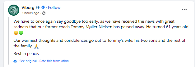Mikkel Venge wrote: “I can’t believe what I have just heard. I can’t believe that my dear friend #tommymøllernielsen has passed away. He was a fantastic friend, a fantastic man, a fantastic listener, a true friend. I will miss our talks about football, about life. Can’t believe you are not here any more ![]()