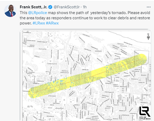 According to Lear-Sadowsky, most of the damage is in West Little Rock, where “several structures,” including both residential and commercial ones, have been damaged. The storm has also caused felled trees and power wires, as well as automobiles that have rolled over. Residents should “stay in their houses,” the mayor of Little Rock requested on Twitter so that emergency officials can begin their job.