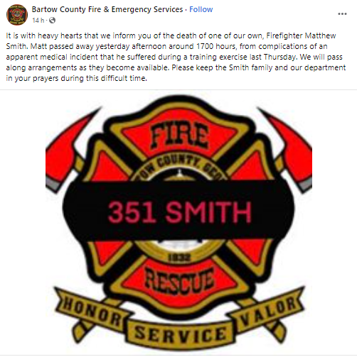 “RIP to Bartow County firefighter Matthew Smith who they say died after a medical incident during training exercises yesterday. ”