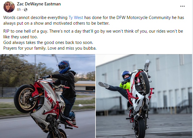“Words cannot describe everything Ty West has done for the DFW Motorcycle Community he has always put on a show and motivated others to be better.