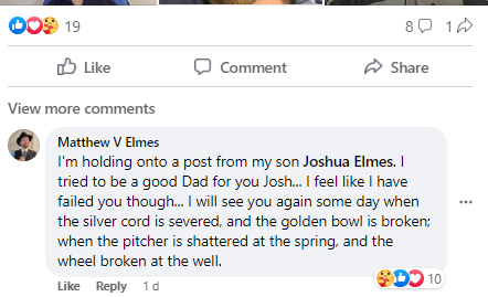 Just two weeks before Joshua Elmes departure, Matthew Elmes shared a memorial his son had created for his father’s birthday. Mr. Elmes said that despite his best efforts to be a good father, he felt like he had ‘failed’.