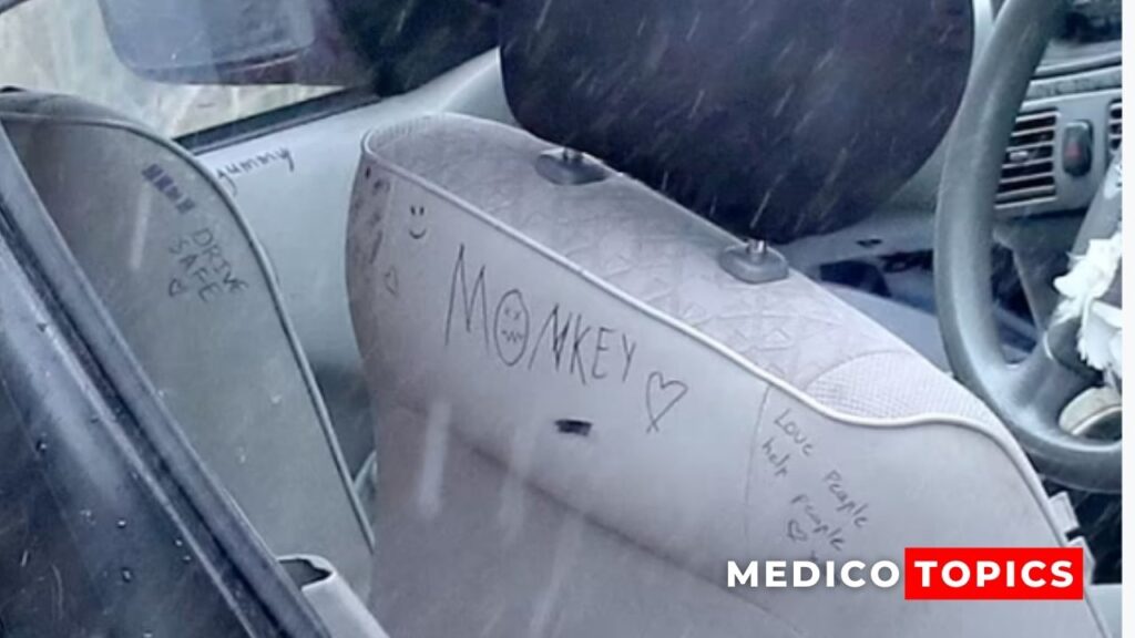 The sad phrases “drive safe” and “love people, help people” were scribbled on the seats of the red Toyota Corolla. (Source : uk-times.com)