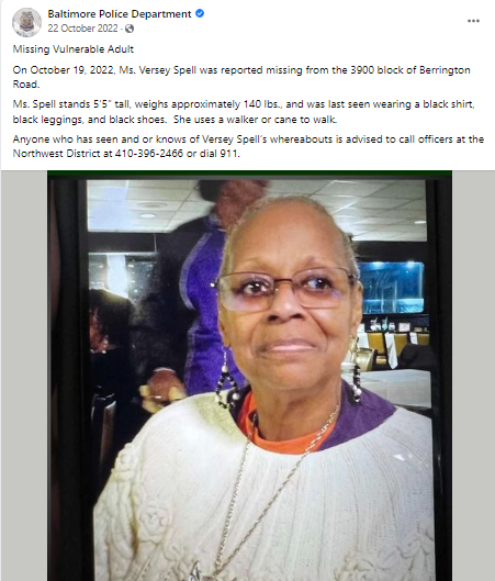 Versey Spell, a 75-year-old lady who was reported missing in October, was recognized by Baltimore Police as the person found inside a container this month in Northwest Baltimore.