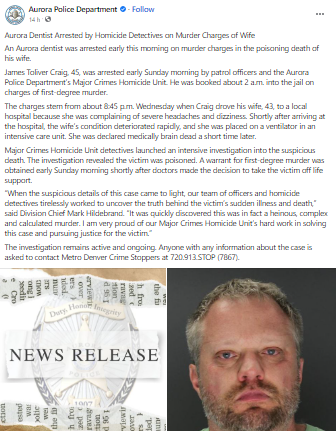 James Toliver Craig, a dentist from Colorado, was charged with murder on Sunday after police said they found evidence that his wife had been poisoned to death. On Wednesday, Aurora resident James Toliver Craig, 45, drove his wife to the hospital because she was experiencing headaches and dizziness.
