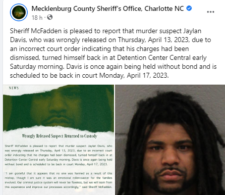 On Thursday, Jaylan Noah Davis, 25, was processed out of the Mecklenburg County Detention Centre Central “based upon a court order indication that the charges against him were dismissed in court that day,” the sheriff said. Early on Saturday morning, Davis returned to the authorities.