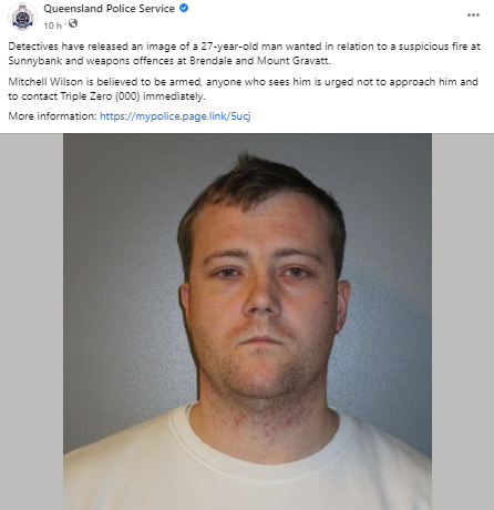 After a suspicious fire at Sunnybank on Thursday night and two other altercations earlier that day where he allegedly discharged a firearm at Brendale and Mt Gravatt, 27-year-old Mitchell James Wilson has been issued an arrest warrant, according to Brisbane Region Regional Crime Coordinator Detective Superintendent Andrew Massingham.