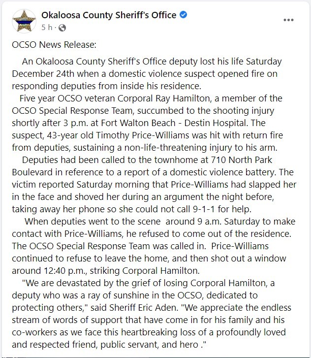 | SHALIMAR, Fla, (Dec 24, 2022) From the Okaloosa County Sheriff…”A Fort Walton Beach area man is in the Okaloosa County jail tonight, charged with first-degree premeditated murder in the shooting death of an Okaloosa County Sheriff’s Office deputy. The OCSO had obtained a warrant for 43-year-old Timothy Price-Williams on a domestic violence battery charge today but Price-Williams refused to exit his townhome at 710 North Park Boulevard. The OCSO Special Response Team was summoned to try to negotiate with Price-Williams to give himself up peacefully. Several deputies, including Corporal Ray Hamilton, entered an area behind the backyard fence of the premises to help establish a safe perimeter. Once they got into position, shots were fired from inside the home and Corporal Hamilton was struck. He was rushed to HCA Fort Walton Beach – Destin Hospital where he succumbed to his injury shortly after 3 p.m. Price-Williams continued to refuse to exit, then came out in a manner that caused another deputy to fire on him, injuring Price-Williams in his right arm. He received medical attention at the hospital and was then transported to the jail on a charge of premeditated murder.” |