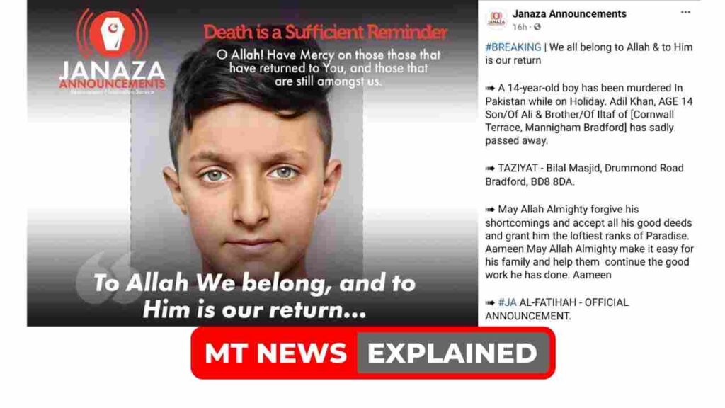 Post stated: “While on vacation, a 14-year-old child was killed in Pakistan. Sadly, 14-year-old Adil Khan has passed away.”